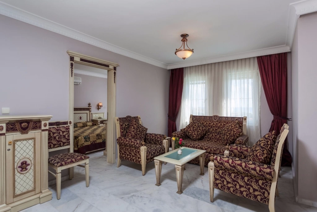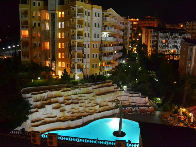 Расположен в 1 км от берега моря, через дорогу, расстояние до аэропорта 135 км, расстояние до центра г. Алании 5 км,