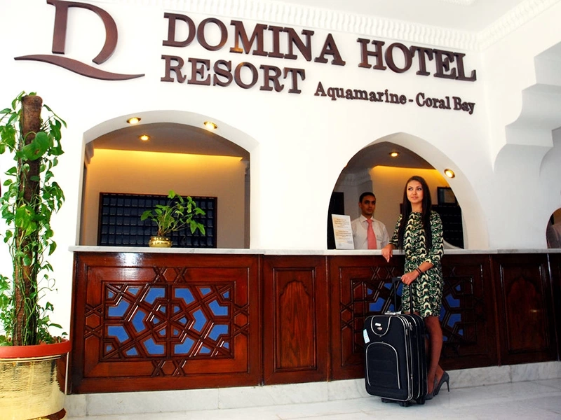 Довжина пляжної смуги комплексу — 1,8 км, протяжність власного пляжу — 440 м, вхід в море — кораловий (з понтона), 4 понтона протягом усього пляжу: 55 м, 53 м, 48 м і 103 м (на понтоні є 2 басейну над кораловим рифом захищені сітками). Є сервіс до пляжу. Гості готелю Domina Coral Bay Aquamarine 5* користуються тільки головним пляжем курорту. Корис