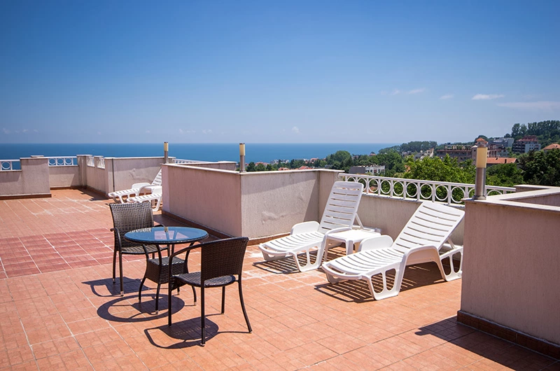 Тераса на даху з садової меблями і шезлонгами.
