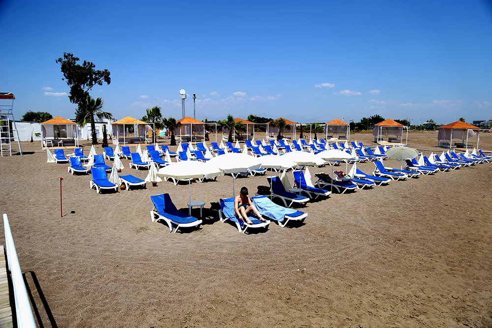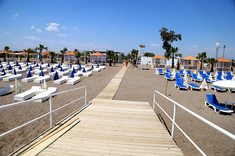 Пляж в 700 м, через дорогу. Курсує шатл на пляж, безкоштовно. Захід в море – пісок. Кабіна для переодягання. В 300 м від готелю є міський пляж (шезлонги і парасольки платно).