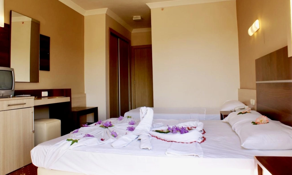 В 250 м від готелю. Між пляжем і готелем є автомобільна дорога, підземного переходу немає. Протяжність пляжу — 15 м. Рушники (платно).