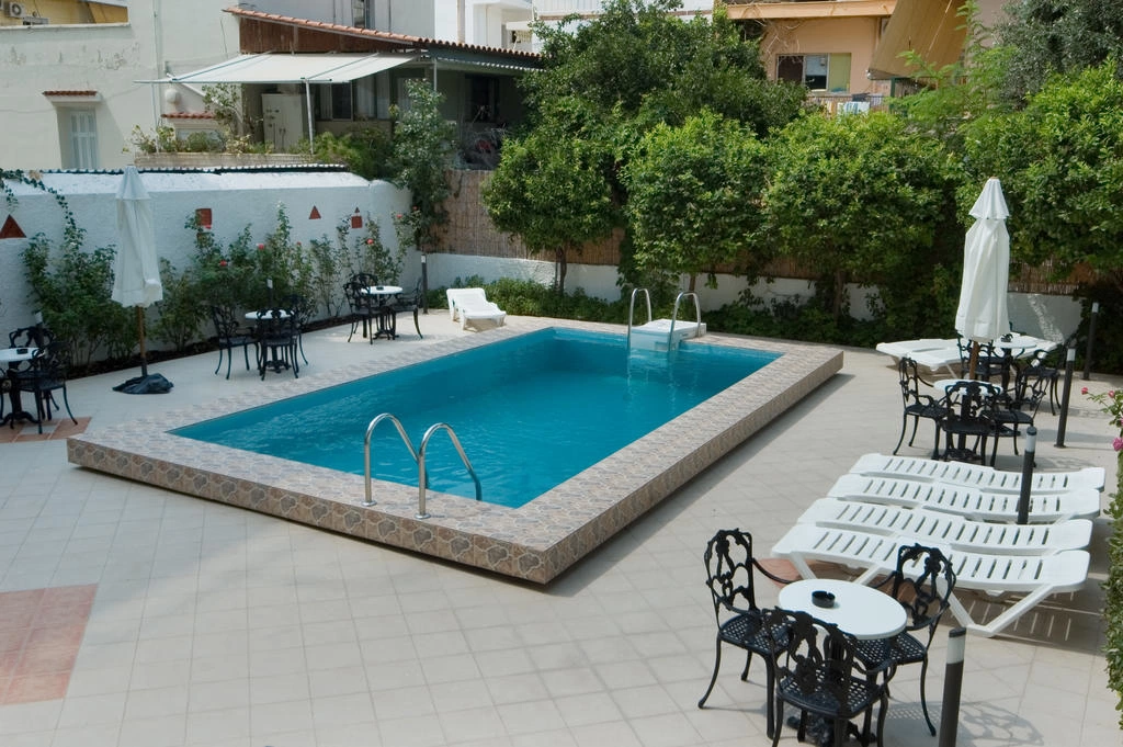 До послуг гостей відкритий басейн, оточений терасою з шезлонгами і парасольками.