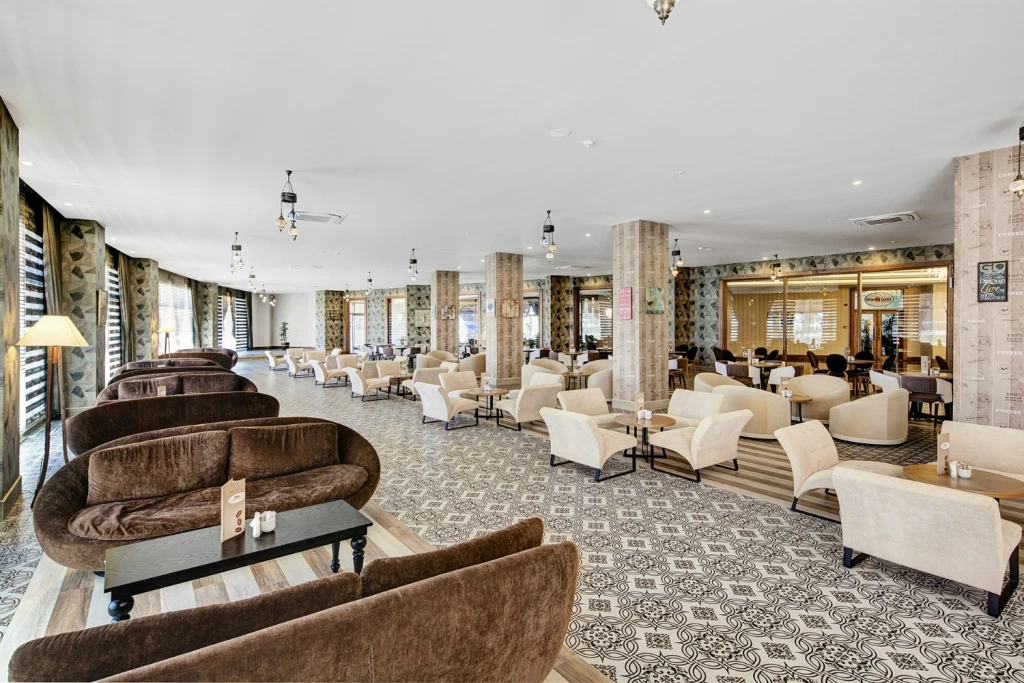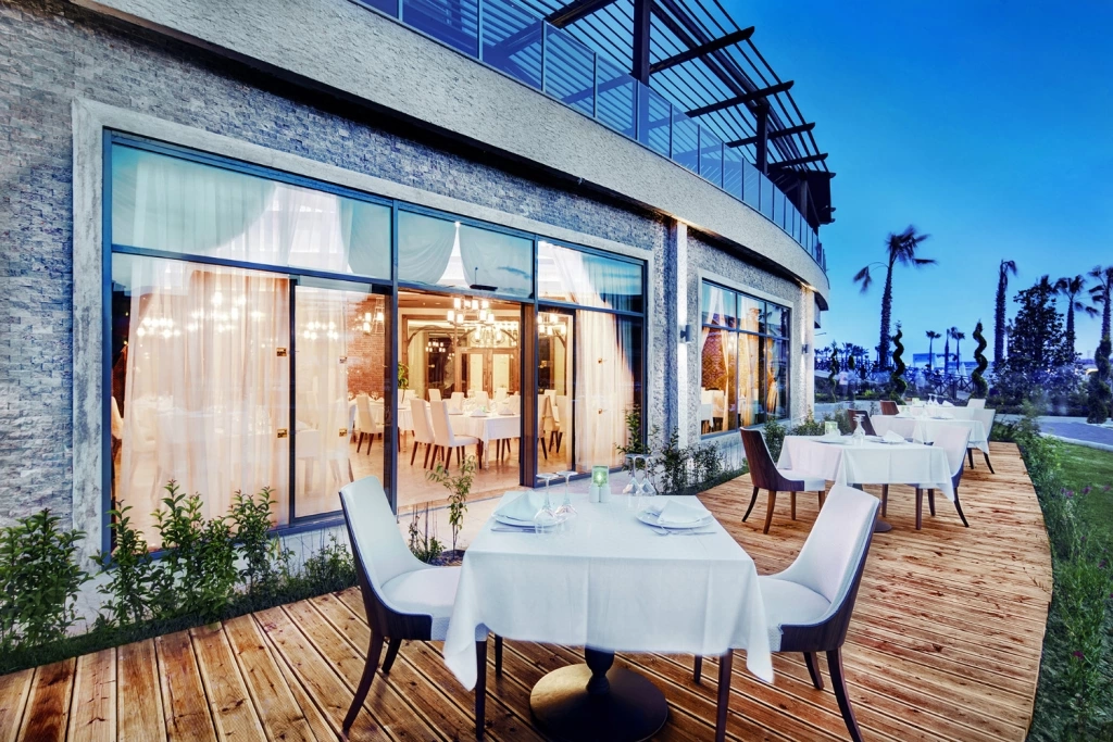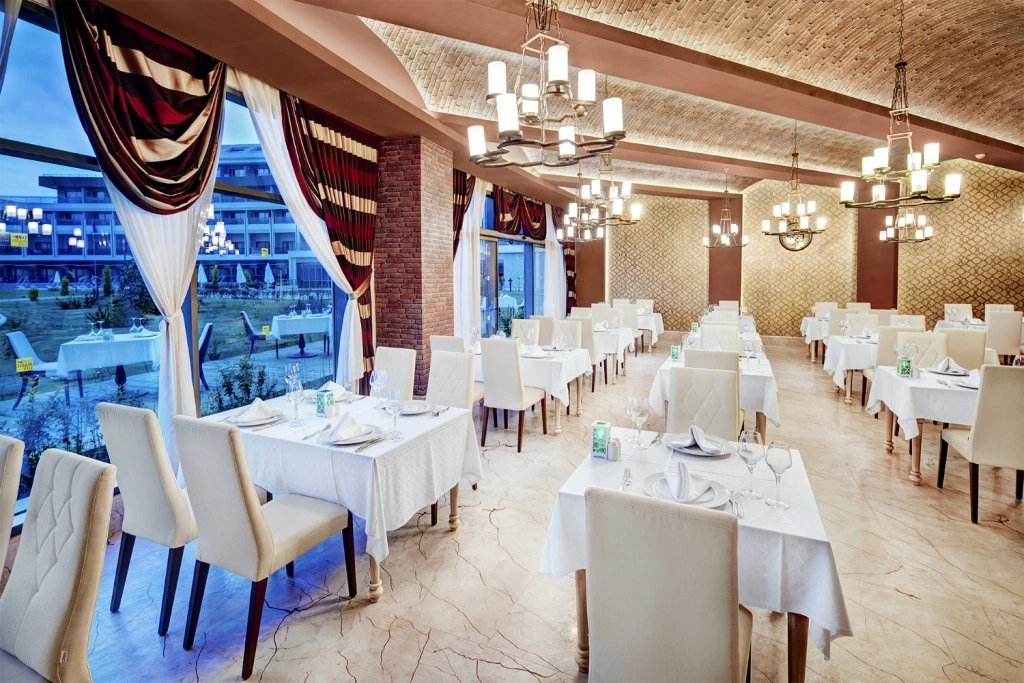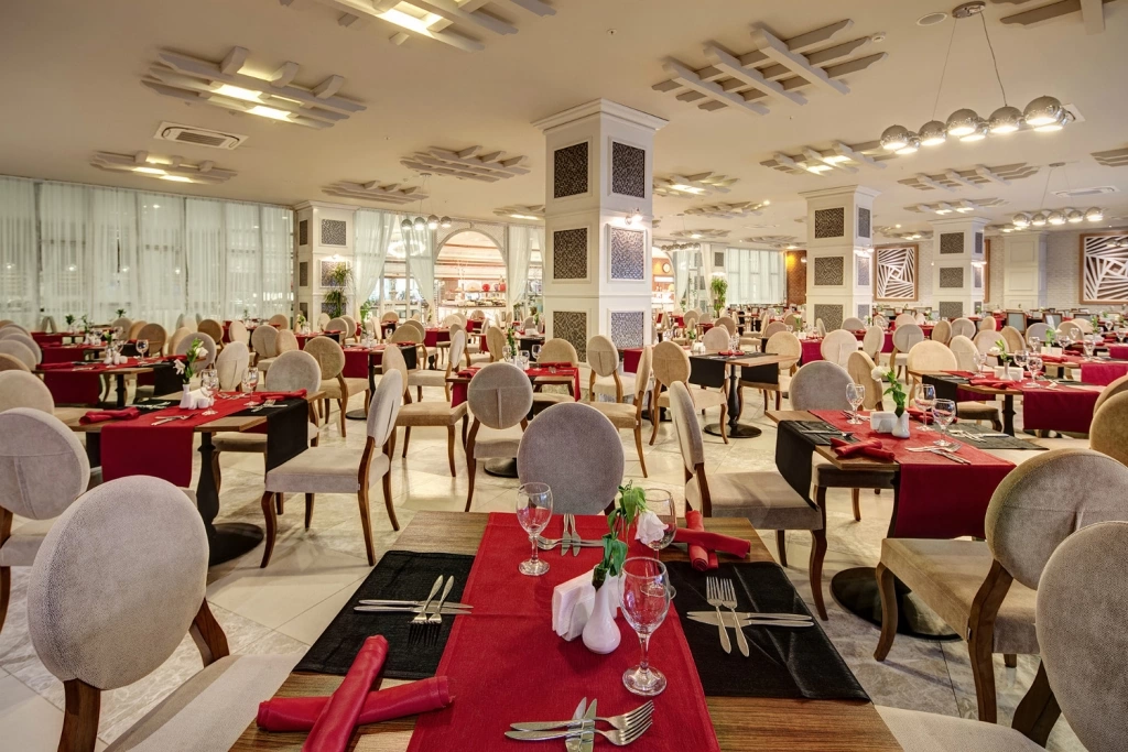 Цілодобова стійка реєстрації гостей, room service: цілодобово (платно), дієтичне і вегетаріанське меню, 7 ресторанів — 1 основний, 6 a la carte (італійський, турецький, рибний, далекосхідний, ресторан 4 сезону, за попереднім записом, за тиждень проживання відвідування кожного ресторану 1 раз — безкоштовно), азіатський — плата за резервацію), 7 барі