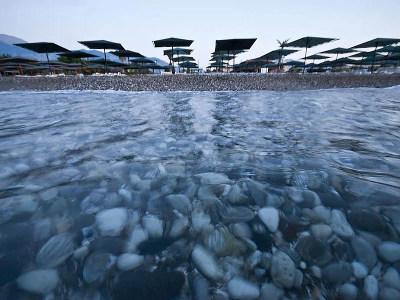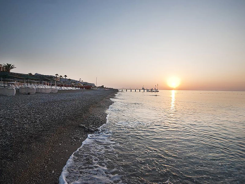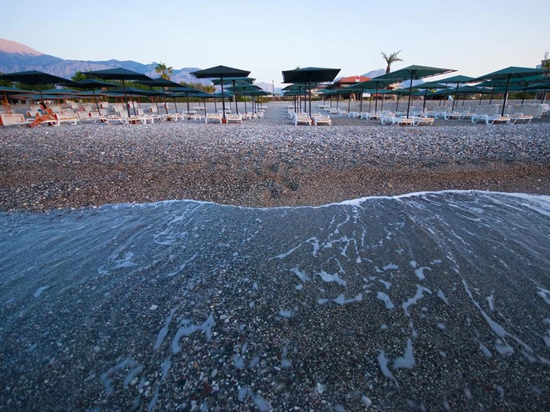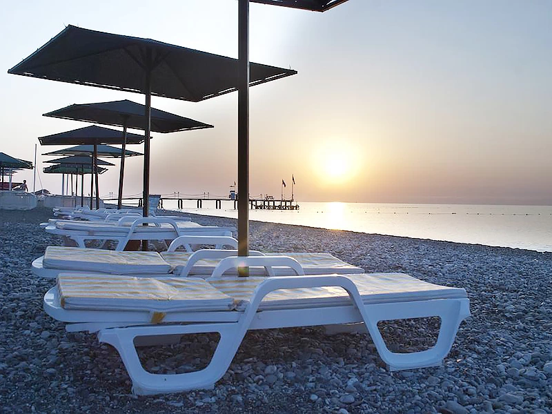 У 150 м від готелю. Між готелем і пляжем проходить дорога, підземного переходу немає. Протяжність пляжу — 30 м. Пляжні рушники видаються під депозит