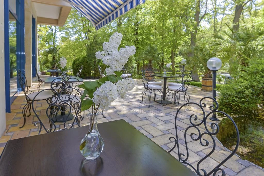 З балконів номерів відкривається чудовий краєвид на басейн або садочок. Поруч з басейном встановлені шезлонги і парасольки.