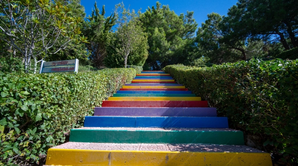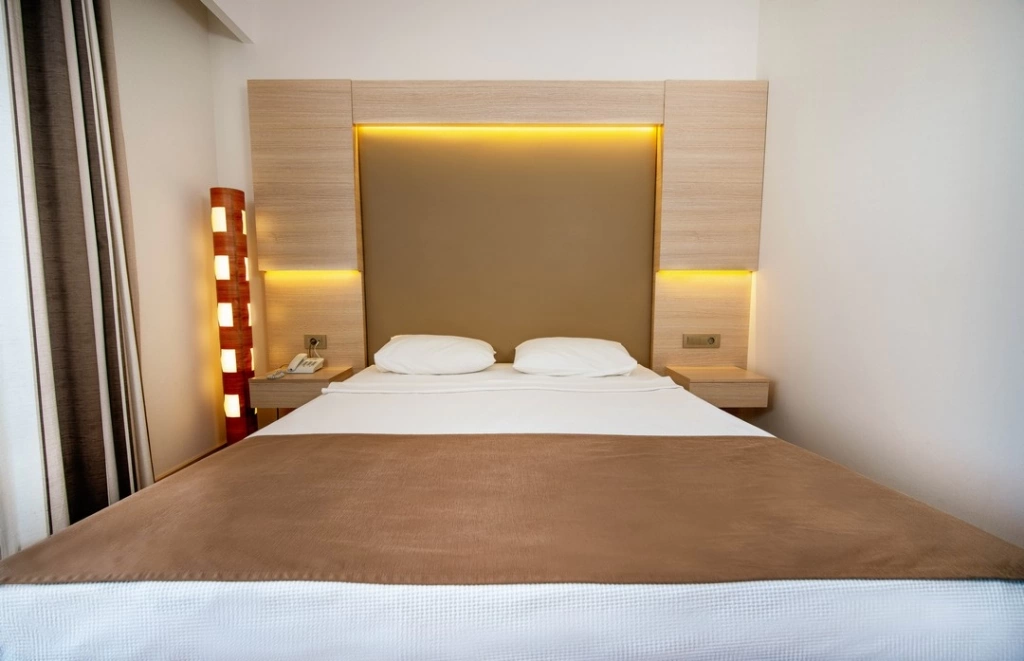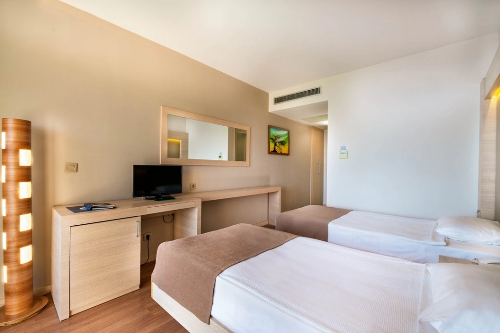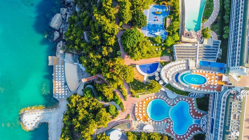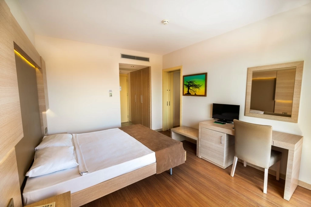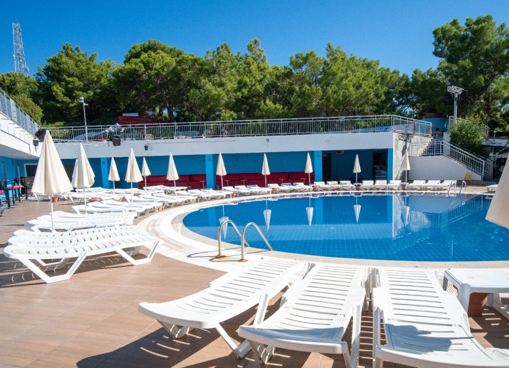 Пляж знаходиться поруч з готелем, являє собою 3-рівневу платформу: 1 рівень – бруківка, 2 рівень --пісок і 3 рівень – дерев'яне покриття. Ширина пляжу – 50 м. Бар на пляжі (гарячі, прохолодні напої і пиво).