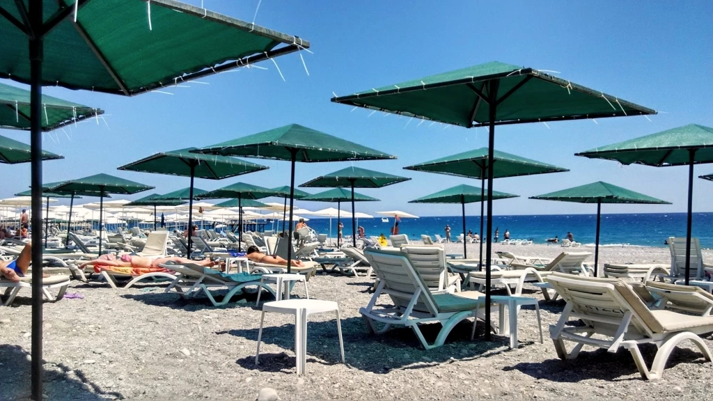 В 100 м від готелю. Між готелем і пляжем проходить променад. Протяжність пляжу — 150 м. Бар на пляжі — безкоштовно.