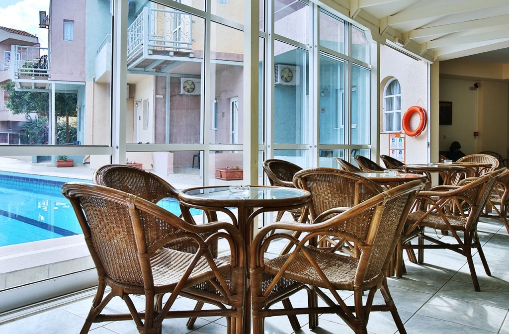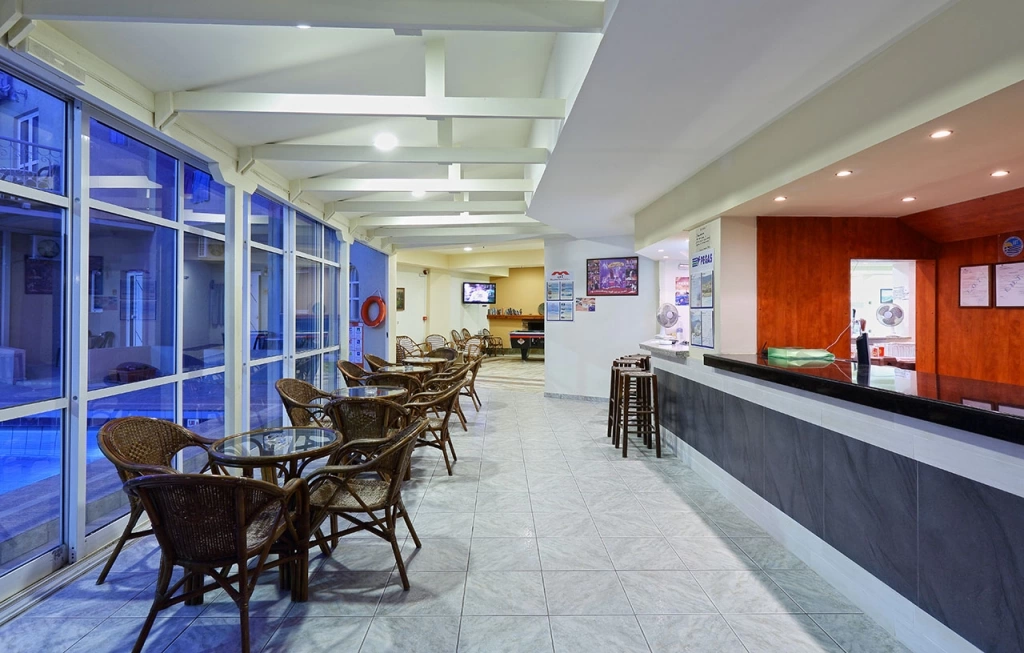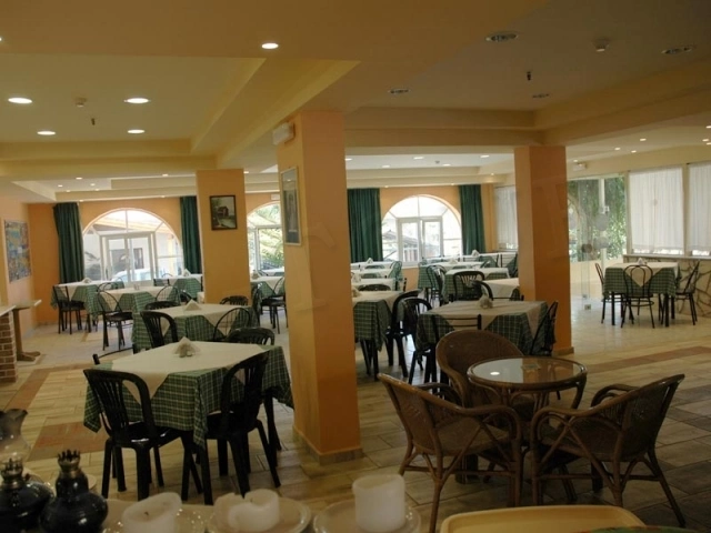 Головний бар оснащений телевізором із супутниковим телебаченням. Головний ресторан у критському стилі пропонує страви шведського столу: континентальний сніданок і вечеря на самообслуговуванні. Щотижневий барбекю вечір і доброзичливе сімейне проживання, ідеально підходять для сімейного відпочинку.