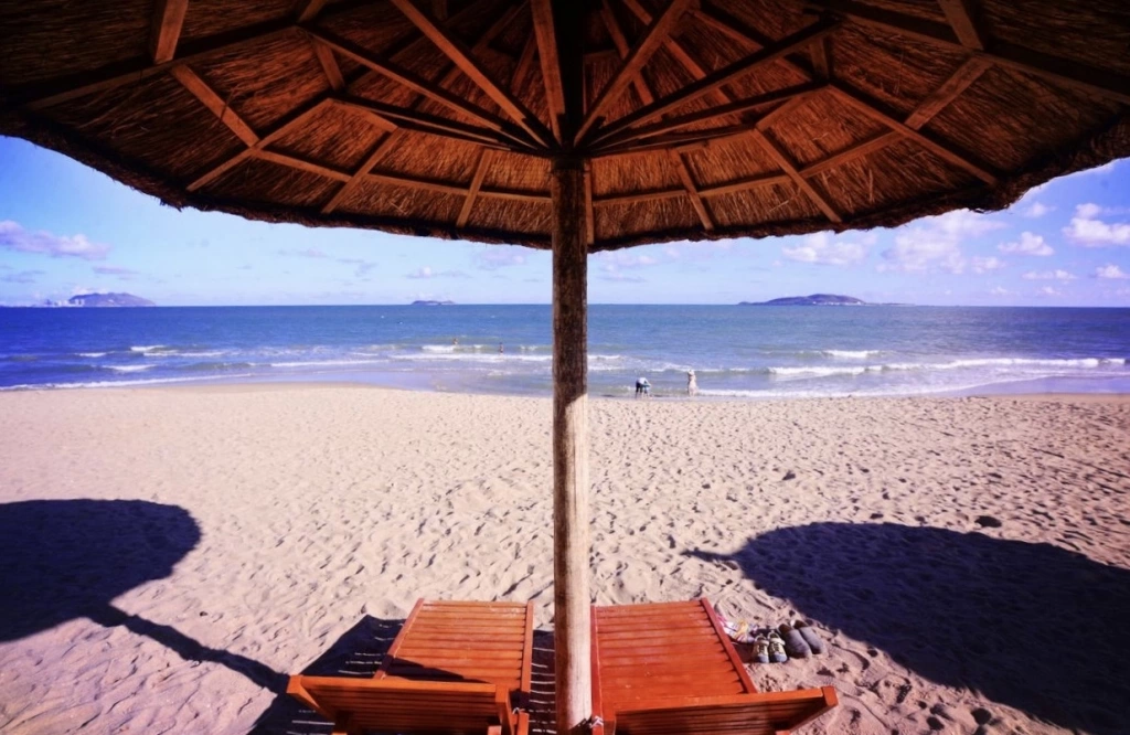 Берег бухти Саньявань — найближчий до Саньє пляж, найбільший на всьому курорті. Берегову смугу довжиною близько 17 км покриває бежевий дрібний пісок. Ширина прибережної лінії становить близько 20-30 м, у відлив кромка прибою відступає на десятки метрів. Вхід у воду пологий, без ям і каменів. Глибина наростає поступово. Мілководді ідеально підходить
