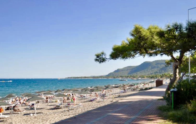 Власна територія на громадському піщано-гальковому пляжі, знаходиться в 550 м від готелю, через дорогу. Протяжність пляжу становить 20 м. Пляжні рушники — платно. Захід в море — велика галька. Автобус на пляж надається 2 рази в день.