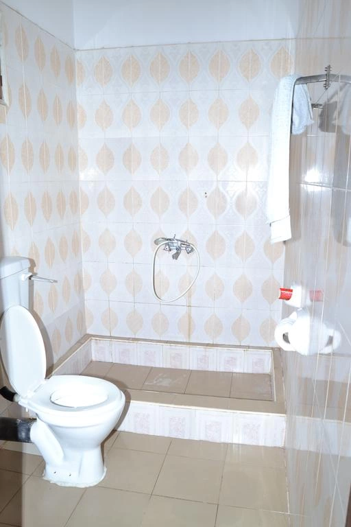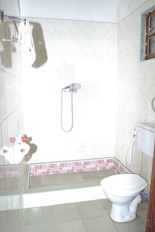 Ванная комната с душем и туалетом, полотенца, кондиционер или вентилятор, москитная сетка, мини-холодильник.