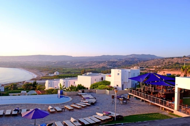 Отель расположен всего в 50 метрах от песчаного пляжа в эксклюзивном тихом месте. Он обладает потрясающим видом на Средиземное море. Отель находится всего в 6 км от всех основных развлекательных и торговых центров в Пафос, Coral Bay и рынка. Деревня Киссонерга (Kissonerga Village) с ее археологическими памятниками, магазины, бары и рестораны в нескольких минутах ходьбы (400 м). Международный аэропорта Пафоса находится в 18 км. Дорога до Международного аэропорта Ларнаки составляет 130 км.