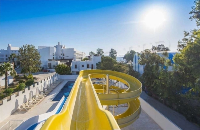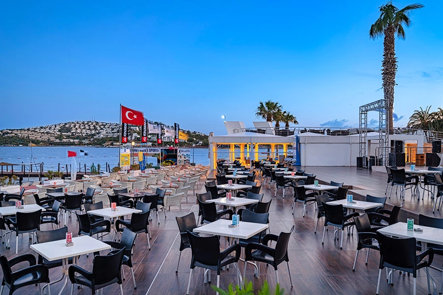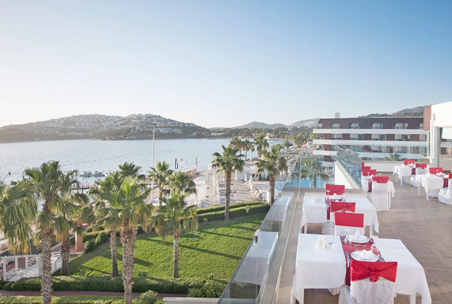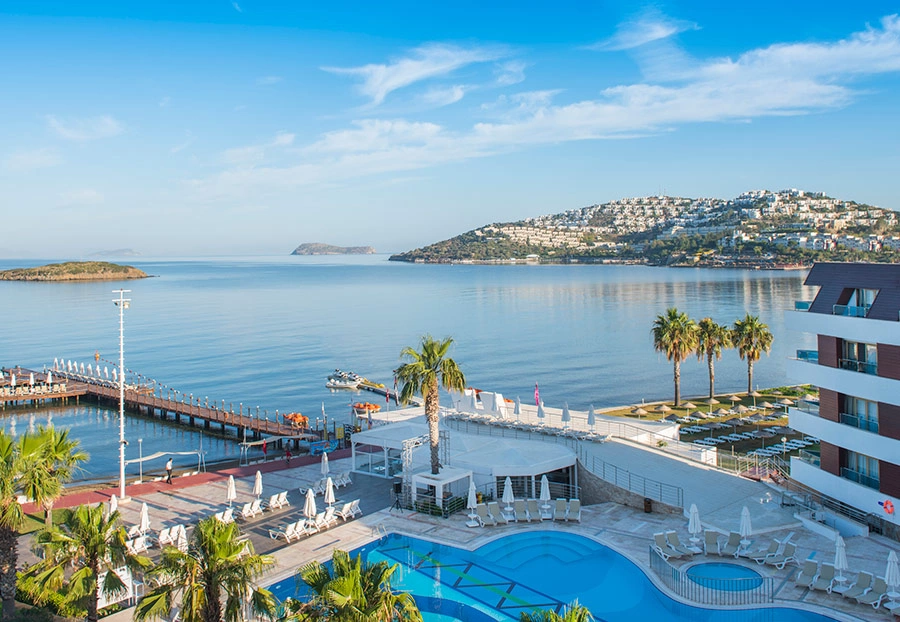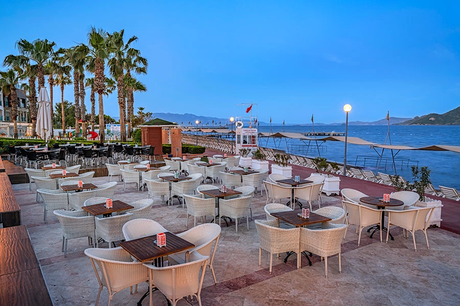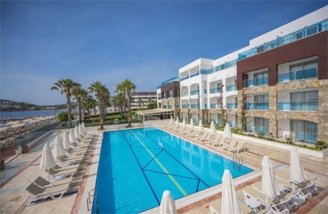 В 55 км от аэропорта и в 22 км от центра г. Бодрум, в поселке Тургутрейс, на берегу моря.