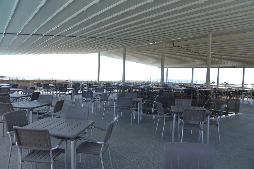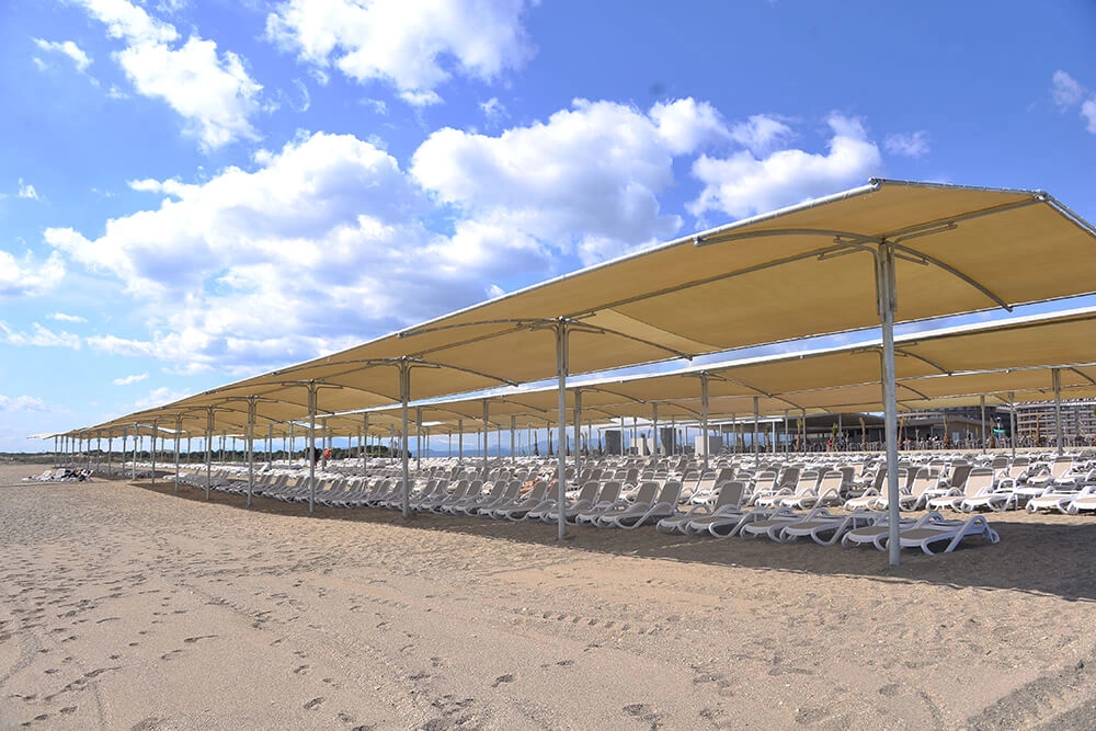 Пляж відзначений Блакитним прапором. Бар на пляжі. Захід в море – пісок, галька.