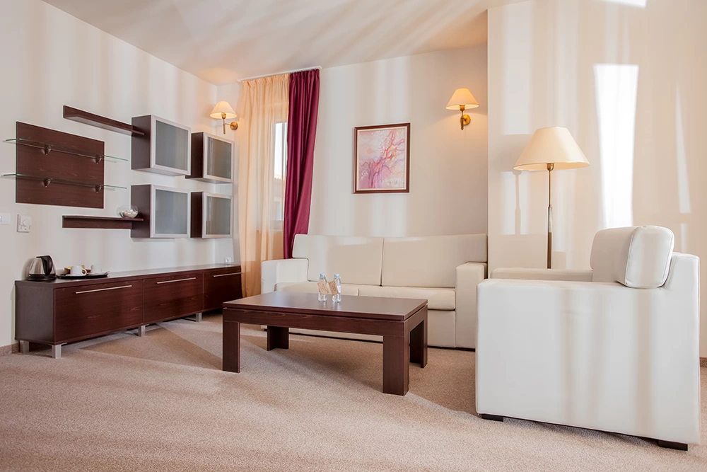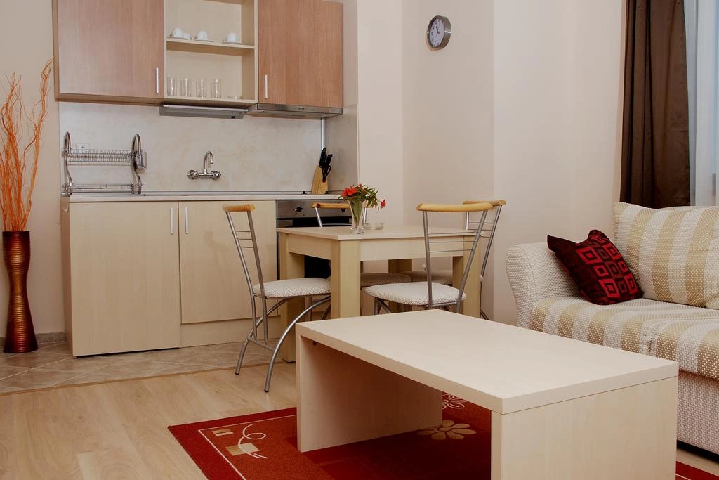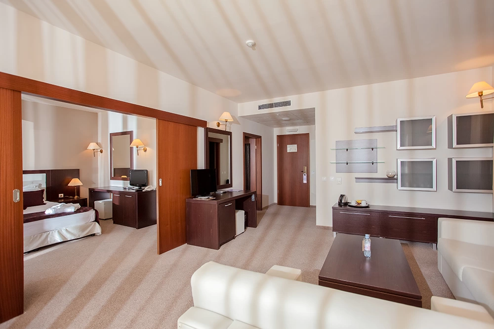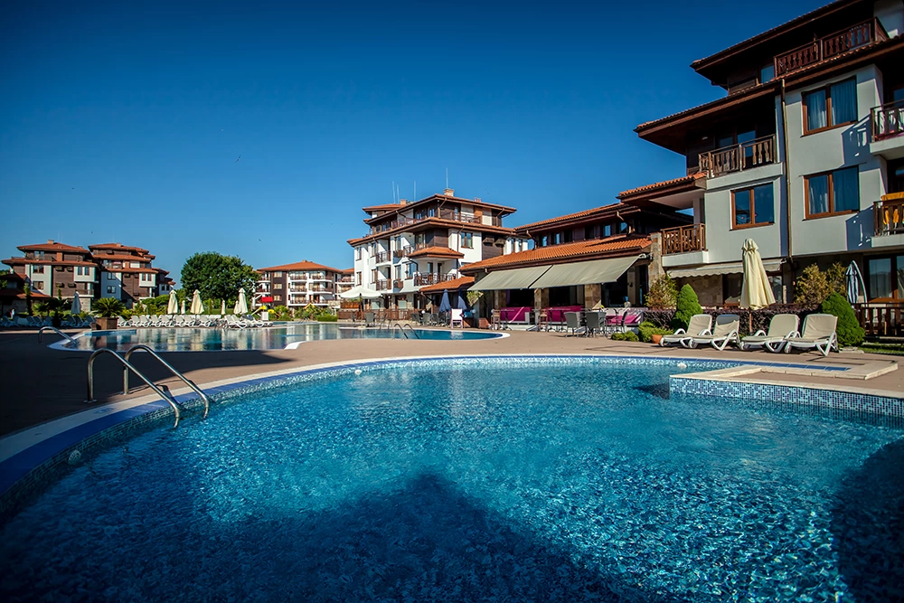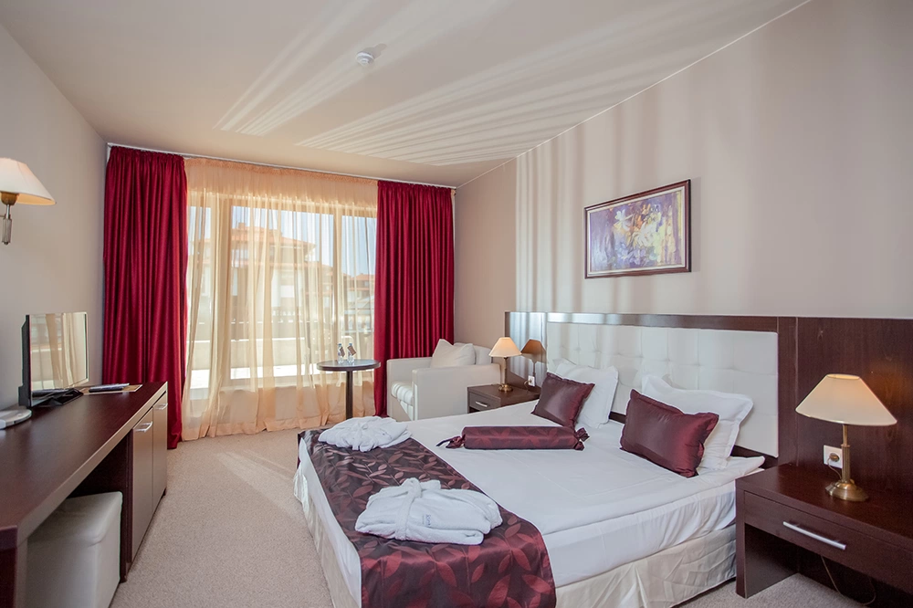 Готель в 100 м від пляжу Св. Тома (шезлонги і парасольки безкоштовно), в 800 м від пляжу Аркутино. Шатл до пляжу Аркутино і назад за графіком безкоштовно (шезлонги і парасольки безкоштовно). Бар на пляжі Аркутино — платно.
