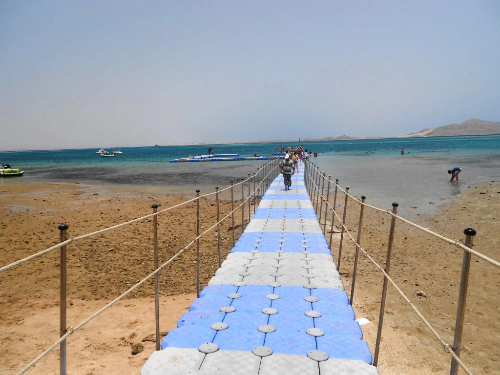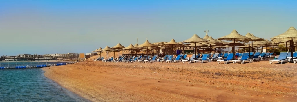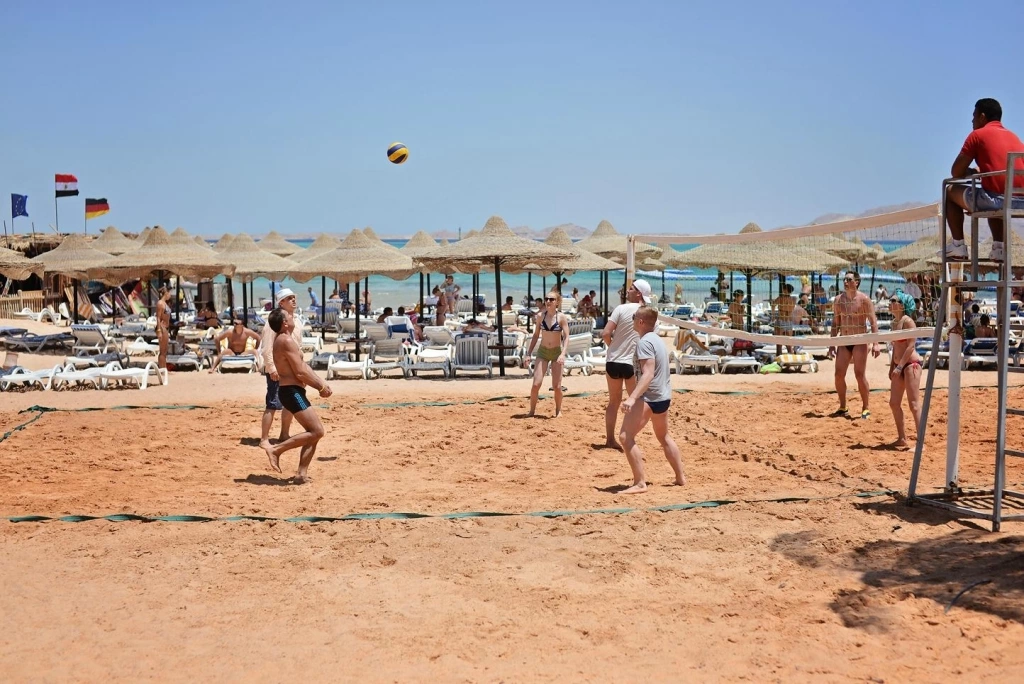 Власний піщаний пляж через неактивну дорогу в 450 м від головної будівлі, протяжність пляжу 100 м, поруч корали, понтон: 85 м. Захід в море тільки з понтона. Рекомендується спеціальне взуття. Пляжна зона загальна Cyrene Island Hotel 4*. Курсує безкоштовний автобус до пляжу. Пляжні рушники — безкоштовно.
