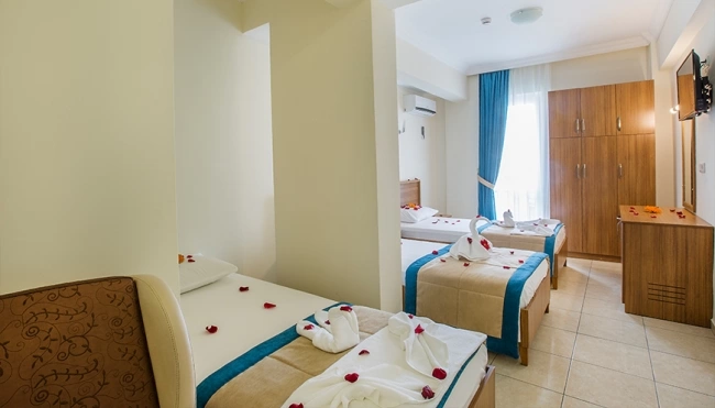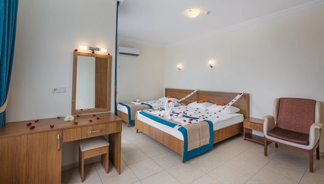 Кондиционер, спутниковое ТВ, мини-бар, сейф (платно), ванная комната с душевой кабиной, бесплатные туалетные принадлежности, балкон с видом на море или горы, ежедневная уборка, бесплатный Wi-Fi.