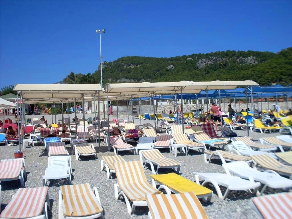 В 300 м від готелю. Між готелем і пляжем проходить дорога і променад. Протяжність пляжу — 25 м.