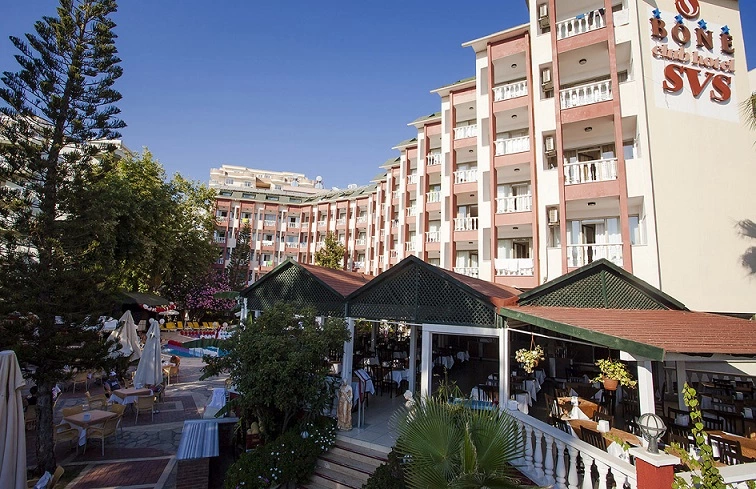 Отель расположен в 140 км от аэропорта г. Анталия, 1 км от п. Махмутлар.