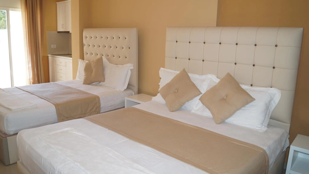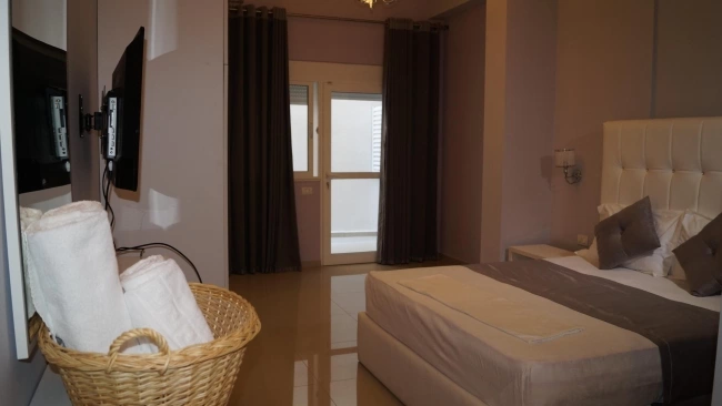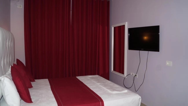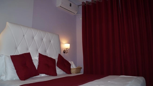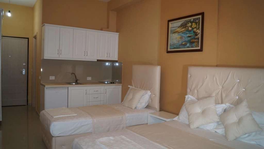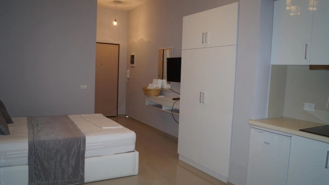 Двуспальная кровать, кондиционер, телевизор, миникухня с кухонными принадлежностями, телефон, холодильник, ванные принадлежности. Уборка в номерах ежедневно. Смена постельного белья в номерах 1 раз в 3 дня.