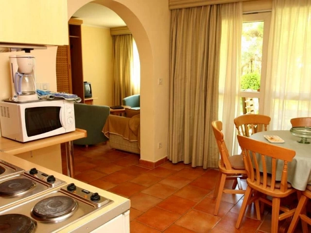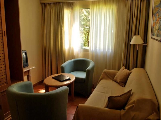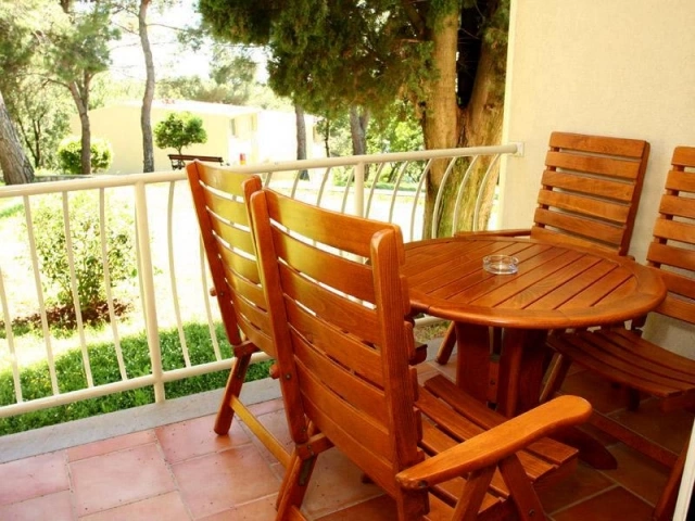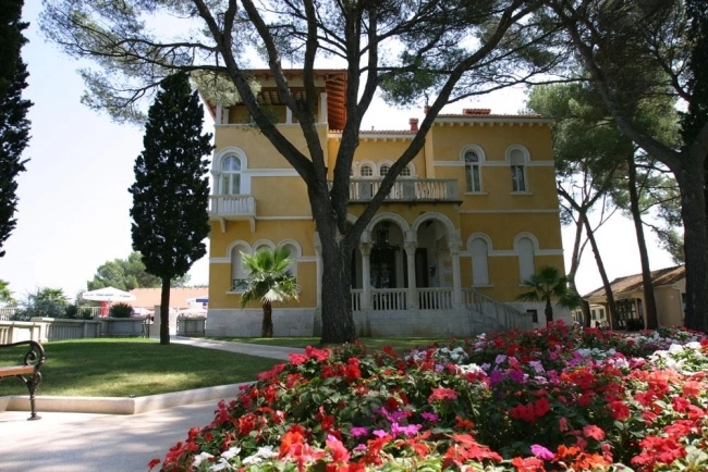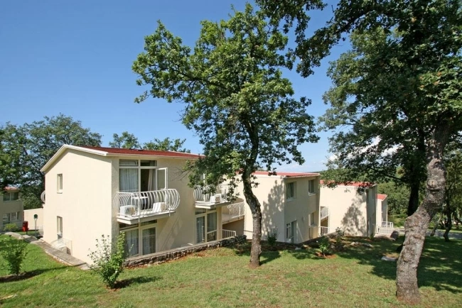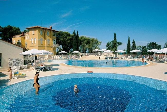 Расположен в туристическом комплексе "PLAVA LAGUNA", недалеко от отеля "LAGUNA GALIJOT", на вершине высокого холма, который покрыт соснами и с которого от крывается незабываемый вид на Адриа тику. Рядом - несколько ресторанов и баров, супермаркет, пиццерия, спортивные пло щадки, дискотека, парикмахерская, от крытый бассейн с пресной водой (28 х 16,7 м), отдельный детский бассейн, бар около бассейна, лежаки и зонтики за до полнительную плату. До Пореча и комп лекса "ZELENA LAGUNA" ходят туристи ческий автопоезд и катера.