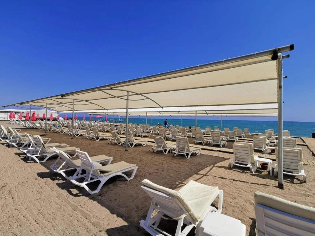 Власний піщано-гальковий пляж знаходиться поруч з готелем. Протяжність пляжу становить 200 м. Захід в море — галька.