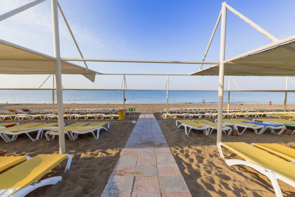 В 300 м від готелю. Між готелем і пляжем проходить дорога і променад. Є сервіс до пляжу. Протяжність пляжу – 250 м.