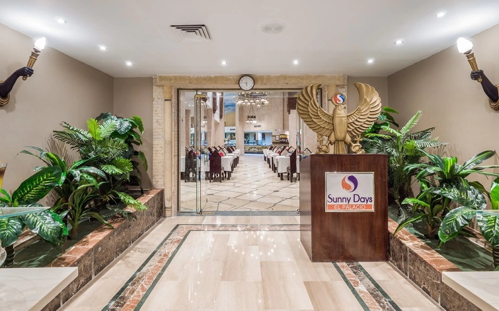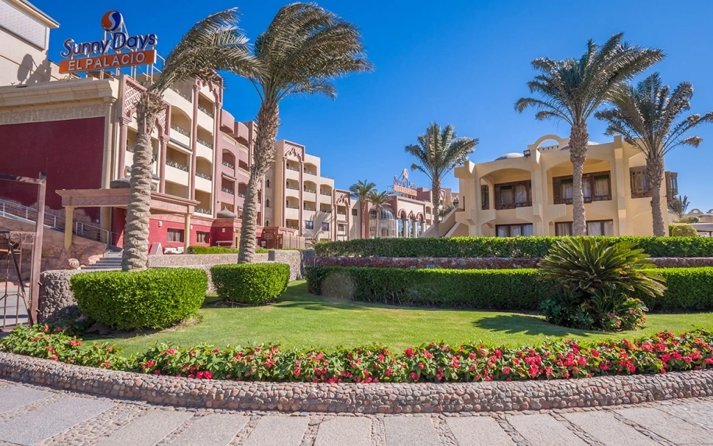 Готель складається з двох об'єднаних готелів: El Palacio та Palma De Mirette. Жвавий курорт Sunny Days Resorts Spa & Aqua Park розташований на узбережжі Червоного моря. Курорт пропонує проживання за системою «все включено». На курорті є пляжі з білим піском, озеленені басейни. Ви також можете зайнятися дайвінгом в лагуні і у коралового рифу біля готелю. Готель Sunny Days пропонує широкий вибір ресторанів і барів на території готелю, в тому числі рясний «шведський стіл» зі стравами міжнародної кухні, італійський ресторан, а також ресторан, де пропонують страви з морепродуктів і де ви можете насолодитися видом на море. Зручності для активного відпочинку включають пляжний волейбол, водне поло, а також повністю обладнаний фітнес-центр. Готель також має свій власний центр водних видів спорту, де ви можете зайнятися дайвінгом, віндсерфінгом і вітрильним спортом.