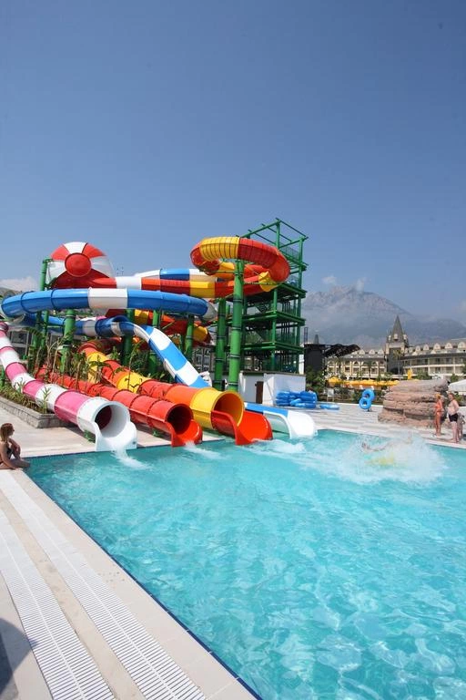 Водні гірки (7 для дорослих, 3 для дітей): 10:00-12:30, 14:00-16:30, бадмінтон безкоштовно, турецька лазня (хаммам) і сауна безкоштовно (по запису), парна безкоштовно, масаж платно, анімація безкоштовно, волейбол на пляжі безкоштовно, баскетбол безкоштовно, водні види спорту платно, тенісний корт безкоштовно (з кварцовим покриттям), прокат тенісних