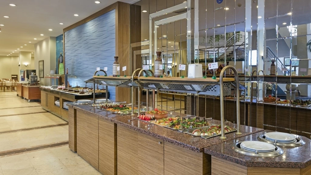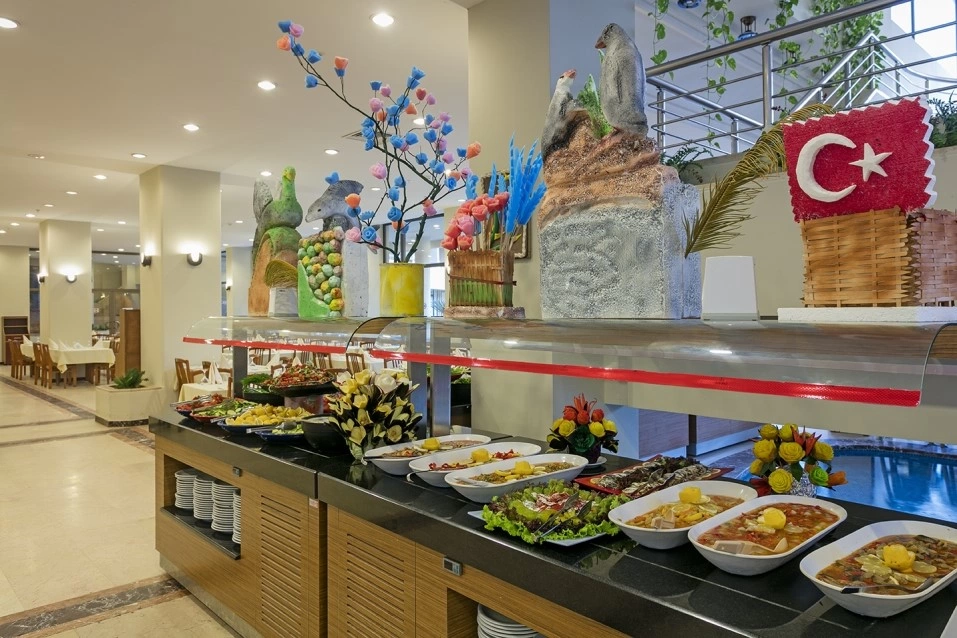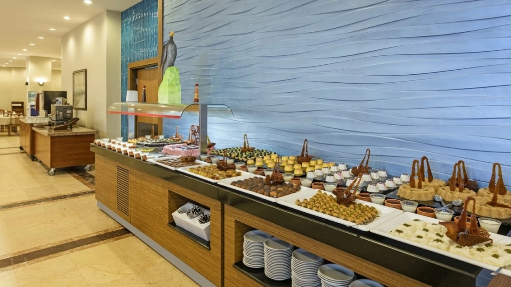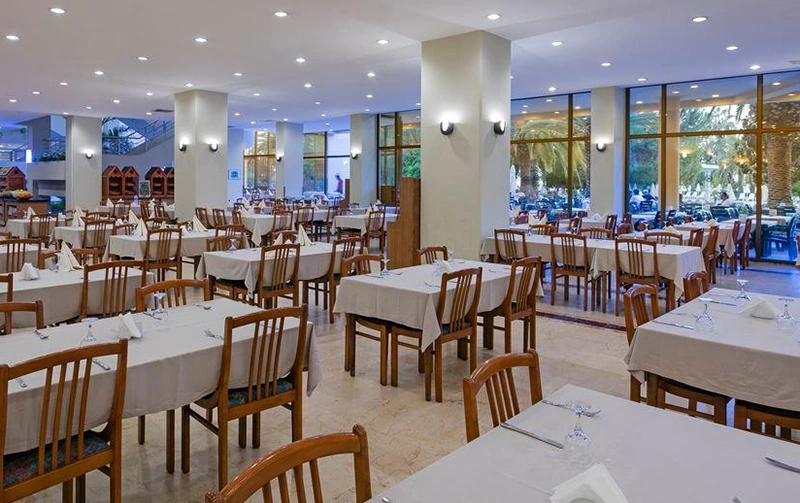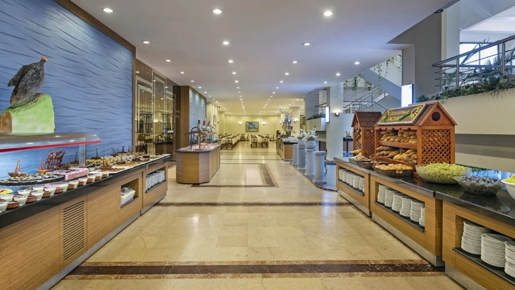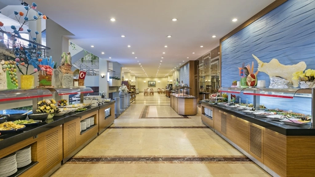 Wi-Fi в лобі (безкоштовно), room service (платно), магазини, 2 конференц-зали (на 100 - 80 чол), 4 бари, 1 основний ресторан, дієтичне і вегетаріанське харчування, 1 ресторан a la carte (рибний і османський, за попереднім записом, за тиждень проживання відвідування ресторану 1 раз – безкоштовно), 1 критий басейн, площа 30 м2 з прісною водою, 2 відк